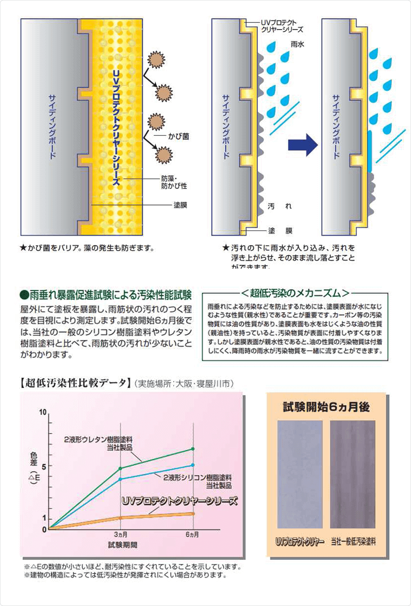 UVプロテクトクリヤーシリーズを施した外壁なら、表⾯に付着した汚れを、⾬が浮かせて流すことができます。さらに、UVプロテクトクリヤーシリーズには防かび・防藻性があり、嫌なかび菌や藻の発⽣を⻑期間にわたり抑制することができます。
